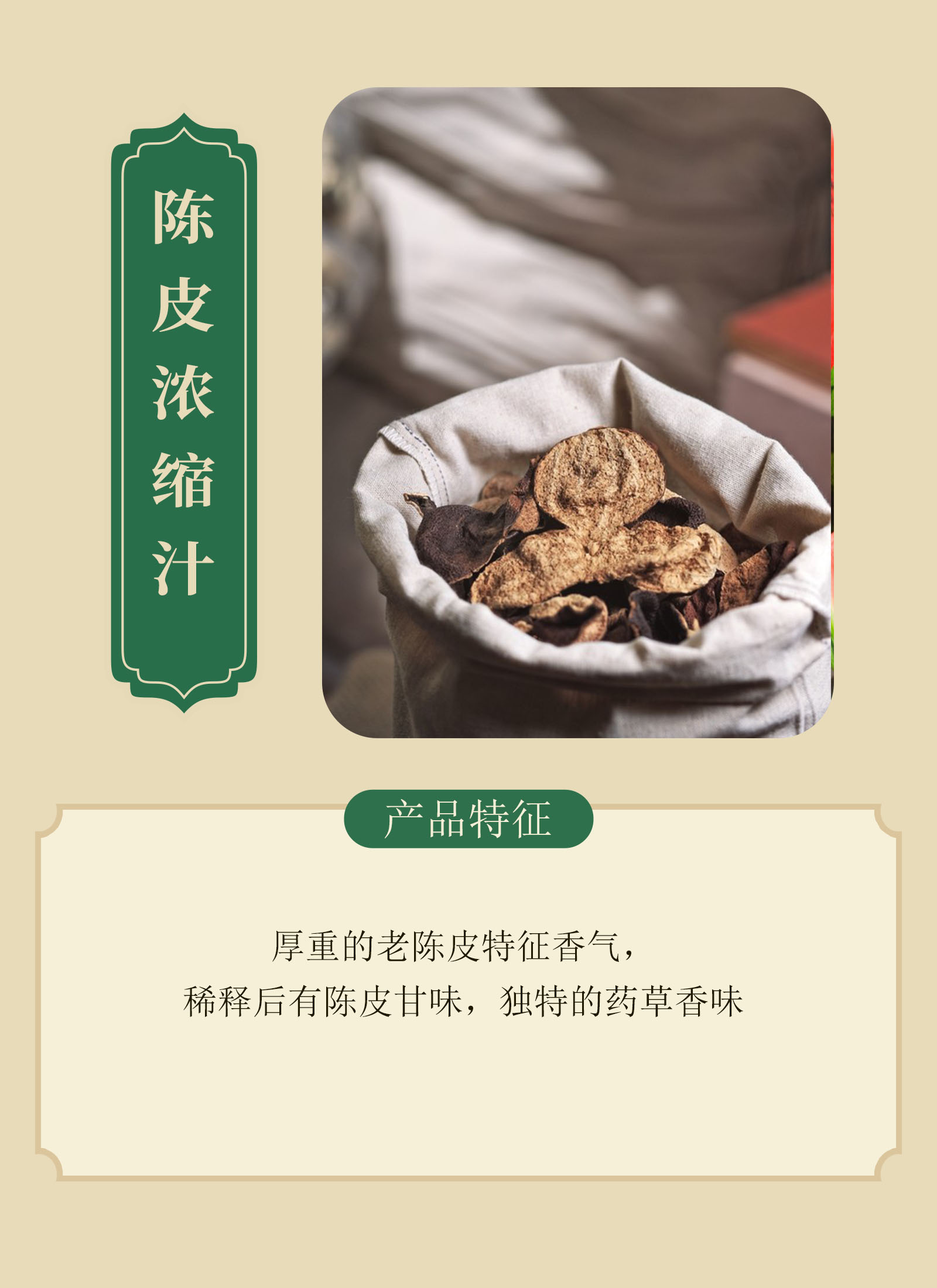 厚重的老陳皮特征香氣,稀釋后有陳皮甘味,獨特的藥草香味