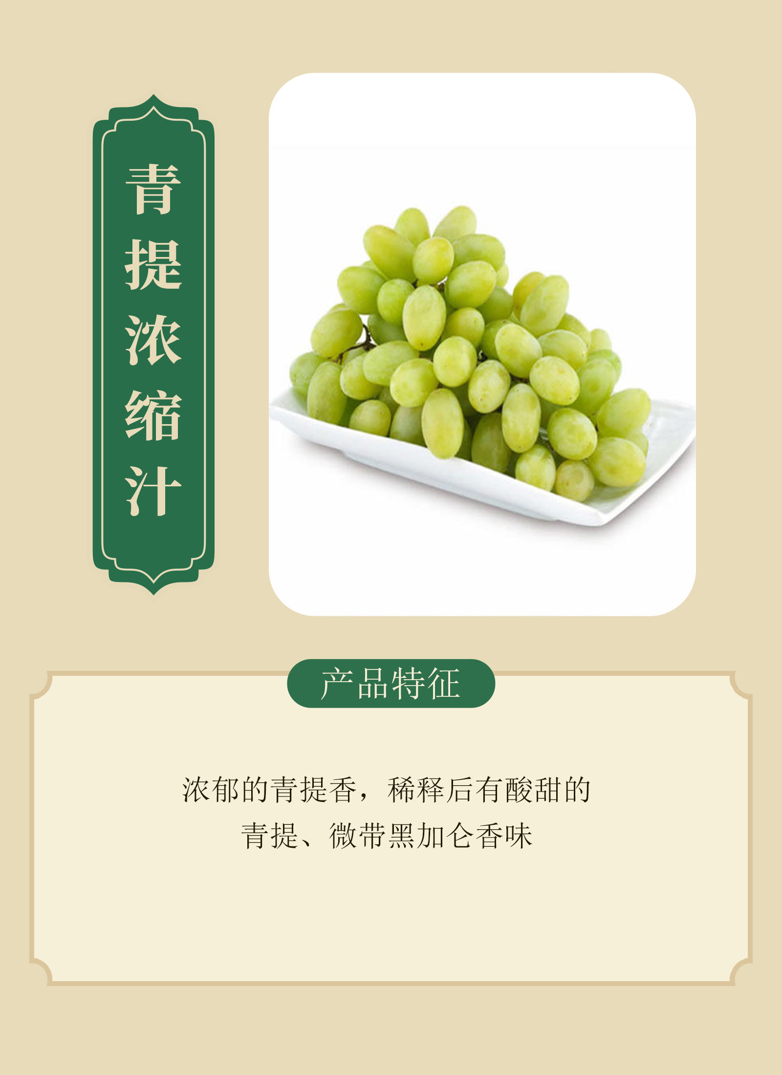 濃郁的青提香,稀釋后有酸甜的青提、微帶黑加侖香味